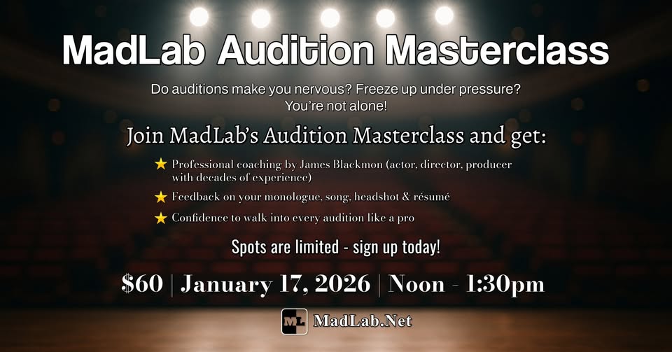 MadLab Theatre is excited to launch a brand-new Audition Masterclass, a 90-minute workshop designed to help actors strengthen their audition technique and stand out in the casting room.